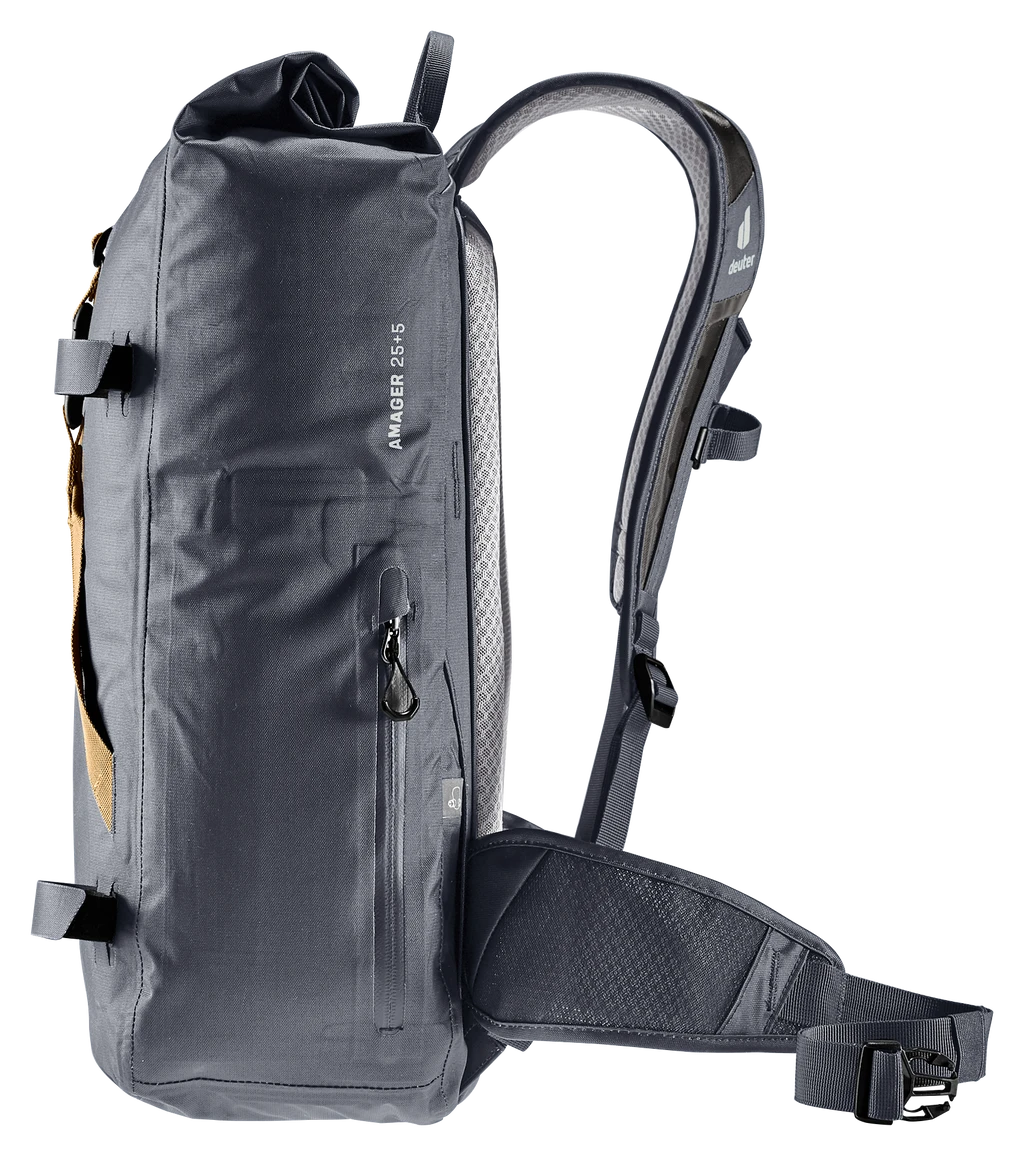 Der Großstadtdschungel fordert Gleichgewicht und ist schweißtreibend zugleich. Da muss der Lastenschwerpunkt des wasserdichten Rucksacks körpernah und die Luftzirkulation maximal sein. Dafür sorgen das komfortable Airstripes Tragesystem mit reduzierter Rückenauflage, das luftdurchlässige Air Spacer Mesh, die ergonomisch geformten, perforierten Schulterträger und Hüftflossen und der verstellbare Brustgurt. Im Inneren lassen sich dank Volumenerweiterung neben Arbeitsunterlagen auch Wechselklamotten für einen Aperitivo nach der Arbeit verstauen.