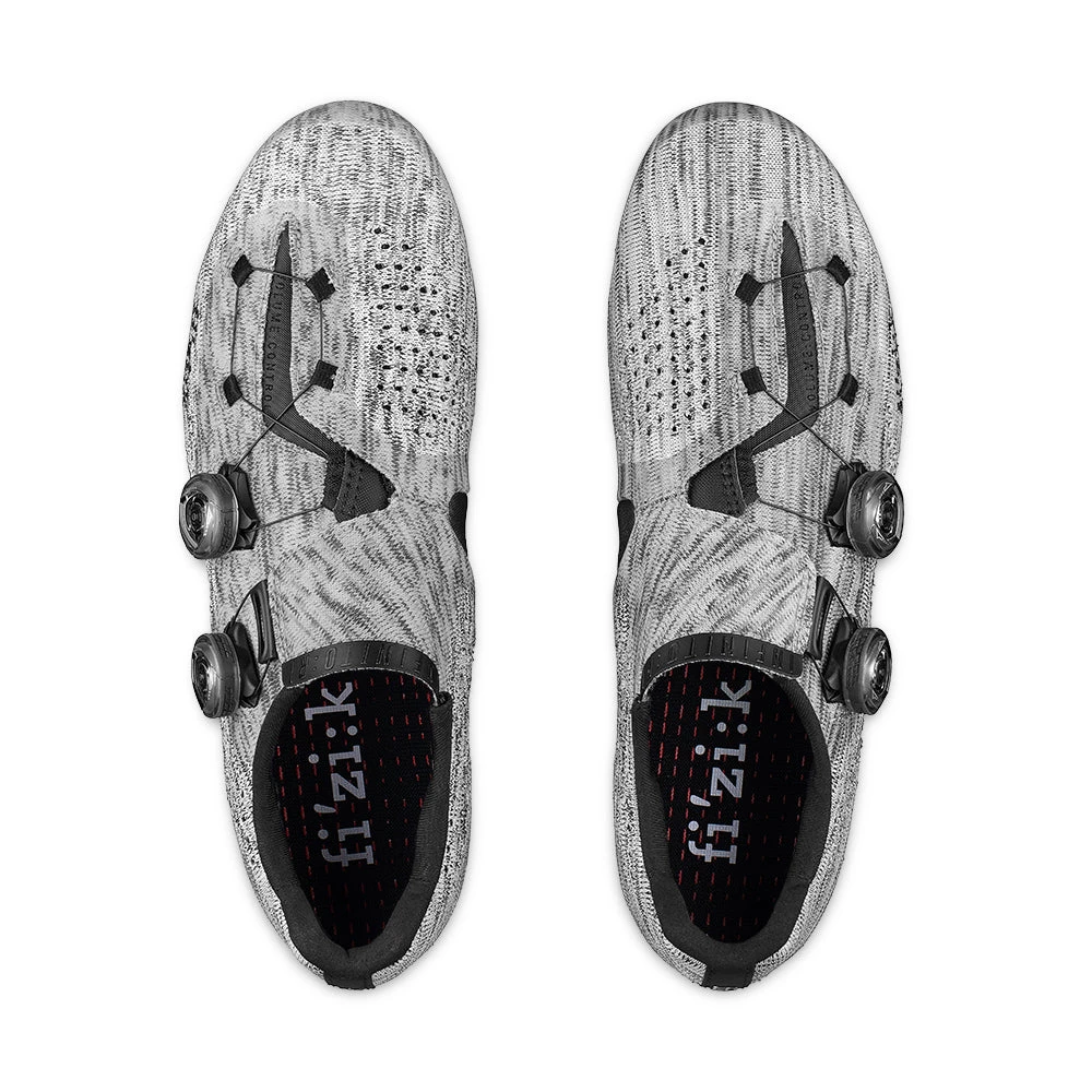 Das Obermaterial des fizik Knit ist traditionellen Obermaterialien aus Gewebe oder Mikrofaser einen Schritt voraus. Diese Oberteile werden mit elektronischen Strickmaschinen hergestellt, die Garnschlingen auf Nadeln miteinander verbinden und die Garnrichtung des Stoffes nahtlos ändern können, um unterschiedliche Maschenmuster zu erzeugen. Dadurch können ausgeprägte Funktionszonen entworfen und geschaffen werden, wobei in Schlüsselbereichen wie Lüftungsschlitzen und Mesh-Öffnungen eine verbesserte Atmungsaktivität im Vordergrund steht. Die zusätzliche wasserabweisende Behandlung schützt vor Regen und Spritzwasser. Um eine effiziente Kraftübertragung auf die Pedale zu gewährleisten, wurden gezielte Bereiche aus wärmeverschmolzenem PU integriert, um dort Unterstützung für den Fuß zu bieten, wo Sportler sie am meisten benötigen. Diese Konstruktion gewährleistet, dass der Schuh gut belüftet und außerdem extrem leicht ist und das bei der gleichen Unterstützung und Treteffizienz wie ein herkömmlich gefertigter Radschuh.